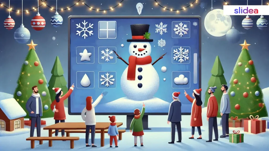 Turn viewers into creative snowman makers. Use the slide to show options like hats, scarves, and buttons. Have guests vote on each to design a virtual snowman. Slidea’s live input feature makes it easy to collect votes and bring snowmen to life with animations. This collaborative activity is fun for kids. and add creativity to your presentations.
