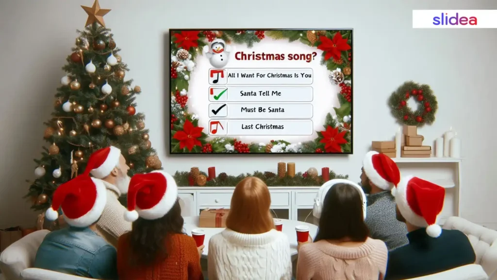 Play short clips of popular Christmas songs and have participants guess the name of the song. Use live polls to gather opinions and highlight correct answers with festive animations. For extra fun Sing along is suggested when the correct song is revealed. This game brings both sorrow and joy. Suitable for both children and adults.