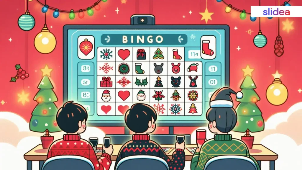 Make bingo cards with Christmas themed items like candy, socks, snowflakes, etc. Use the slides to randomize the items and organize the game. Slidea’s presentation integration tools ensure fairness and make it easy to manage multiple players. Add to the excitement by giving away festive prizes to the first few winners.