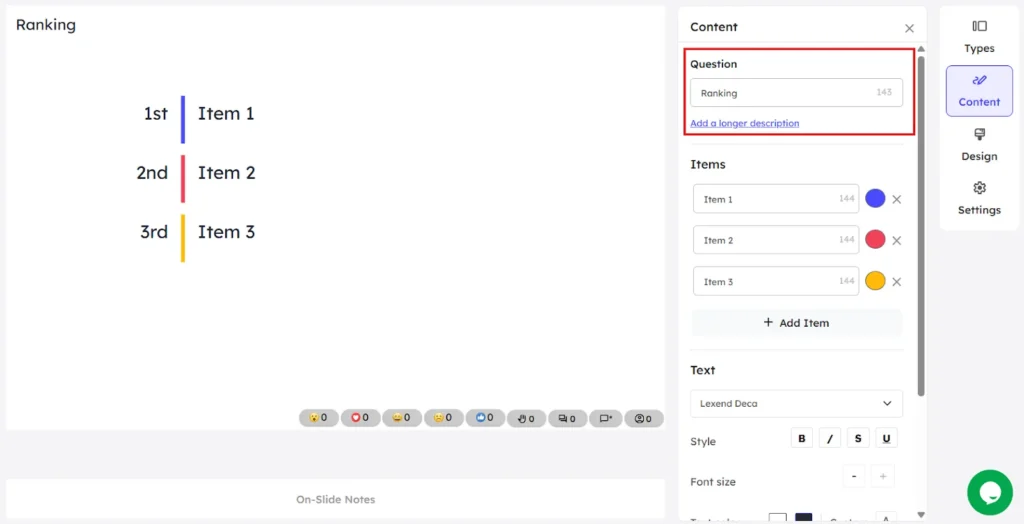 The Ranking slide lets participants arrange options based on preference or priority. It’s great for decision-making, feedback, and interactive comparisons!